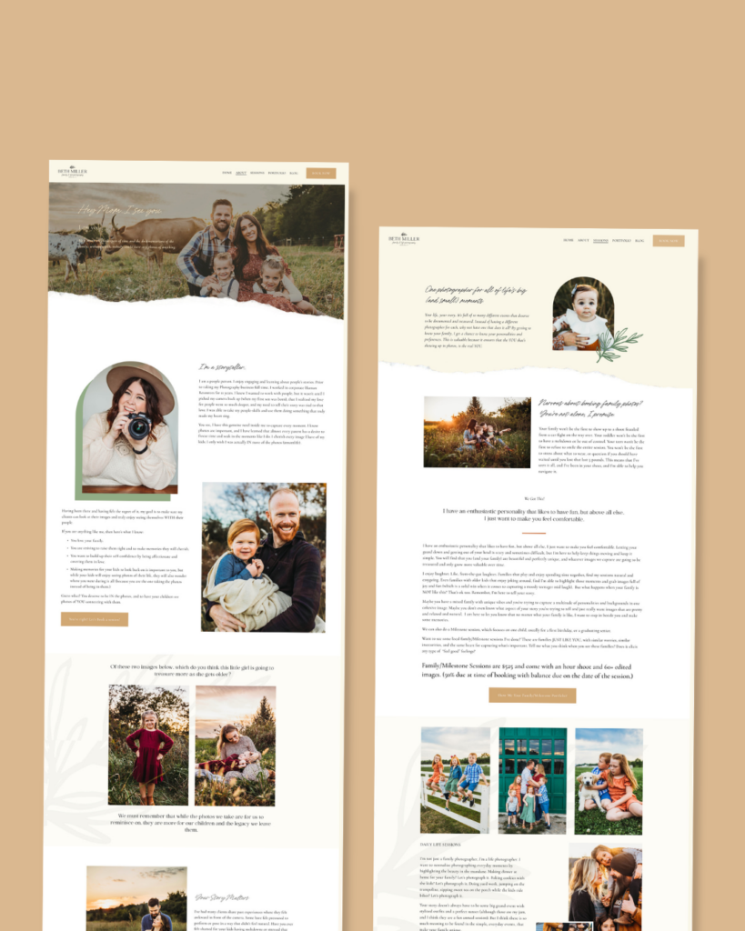 Done-for-you copywriting is included in every full brand and website project we take on, and Beth’s site is a beautiful example of why that matters. Her copy needed to capture the warmth and genuine passion she brings to every session, her deep love for the families she photographs and her commitment to preserving moments that will outlive all of us. It needed to sound like Beth, just polished, strategic, and built to connect with the clients who were already looking for exactly what she offers.